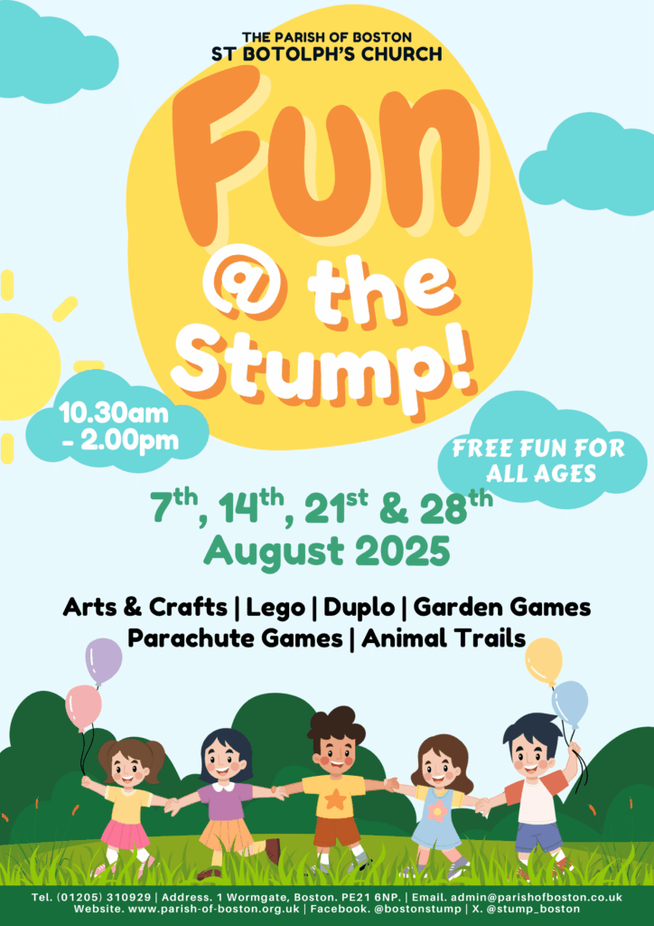 Bring your children to St Botolph’s Church, Boston, this August for Fun @ the Stump 2025, a series of free summer activity sessions designed for children and families.