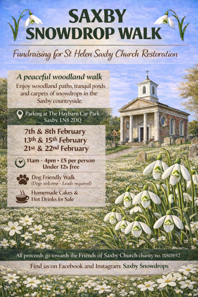 Friends of Saxby Church are hosting the Saxby Snowdrop Walk, a peaceful woodland walk opening over three weekends in February (7th – 8th, 13th – 15th and 21st – 22nd), raising funds for the restoration of St Helen’s Church, Saxby, a historic local landmark.