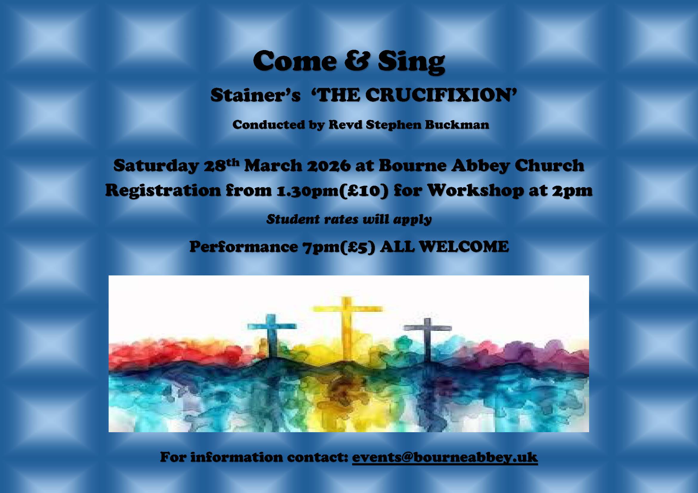All are warmly invited to Bourne Abbey Church for a special Come & Sing day featuring Stainer’s The Crucifixion, conducted by Revd Stephen Buckman. This workshop‑and‑performance event is open to all singers, whether experienced or new to choral music.